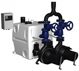 Компактная канализационная насосная установка состоит из одного или двух 450 литровых накопительных резервуаров, двух горизонтальных погружных канализационных насосов типа SL, встроенным контроллером, аналоговым датчиком уровня и соединительными элементами.