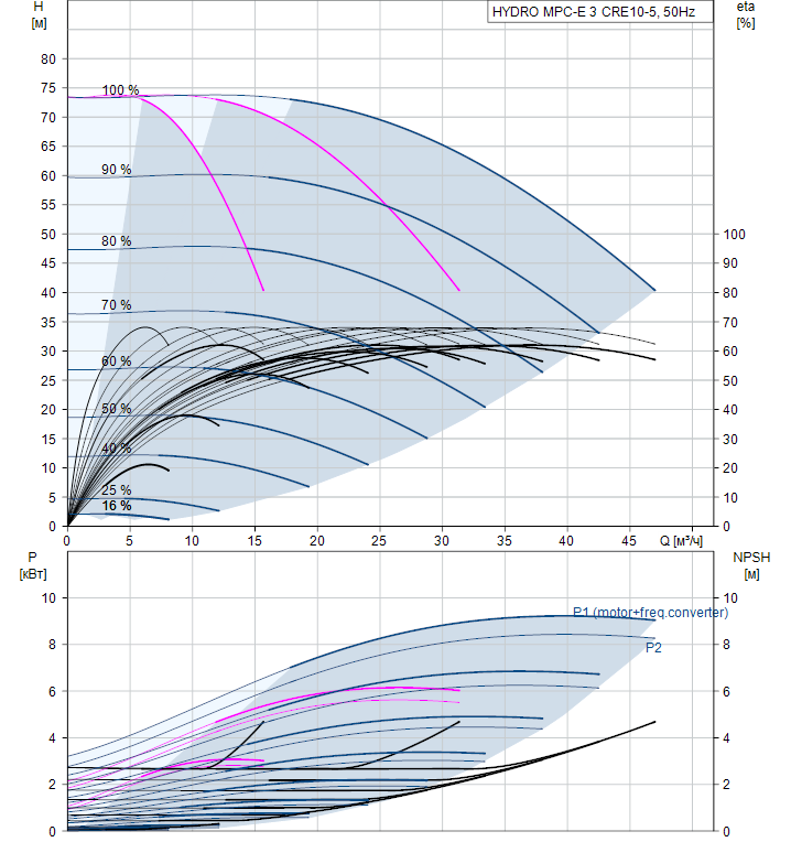 Начиная от 0,37 и до 22 кВт, все станции оснащены насосами CR, CRE, с двигателями со встроенным преобразователем частоты и высокоэффективными постоянными магнитами. Общий КПД этих электродвигателей лучше, чему у двигателей соответствующих стандарту IE4 по IEC60034-31, хотя данный стандарт применяется только для электродвигателей.