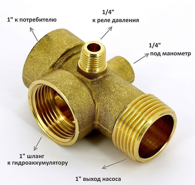 Латунный пятивыводной адаптер используется в автономных станциях водоснабжения. Данный адаптер имеет резьбовые присоединения для подключения трубопровода, идущего от насоса во внутридомовой водопровод, мембранного бака, реле давления и манометра.