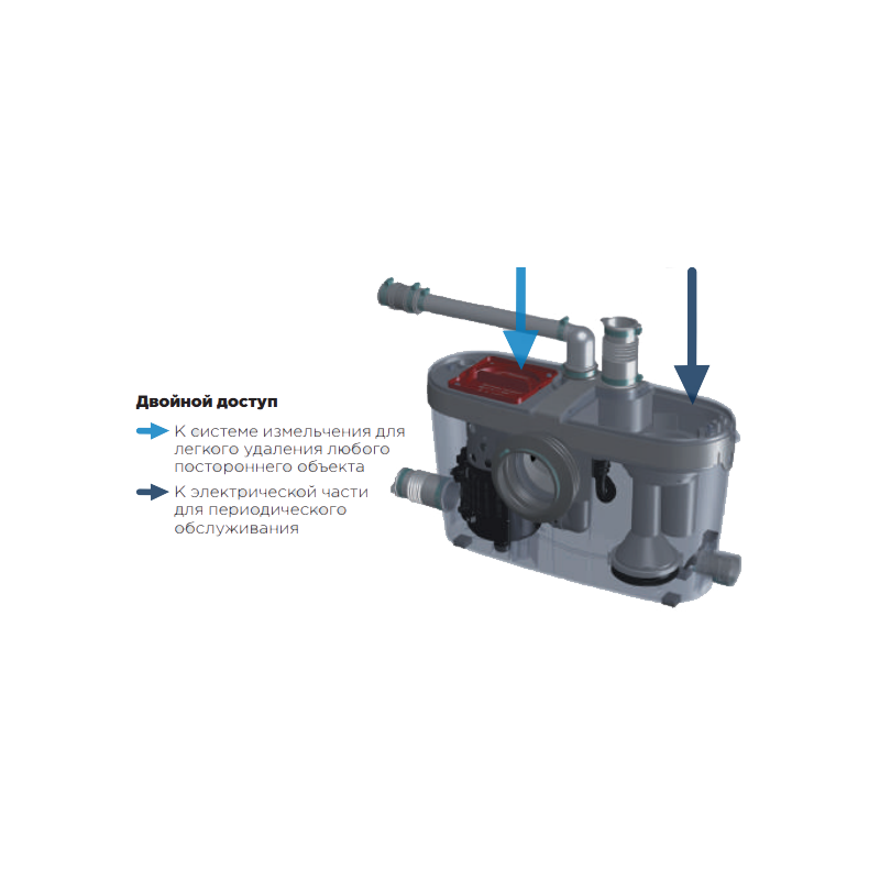 Значительным плюсом модели являются металлические лопасти ножей (измельчителя), которые позволяют эффективно справляться с фекальными отходами. Измельченные фекальные массы откачиваются насосом, а обратный клапан исключает попадание стоков обратно (как и фонтанирование их при засорах).