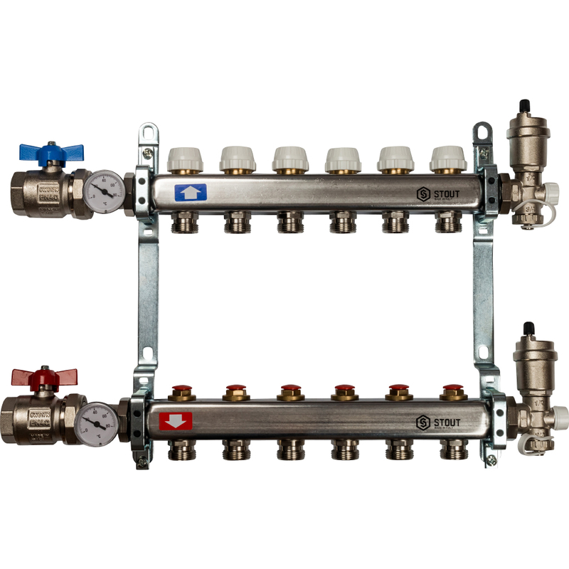 Коллекторные блоки STOUT производятся в Италии под тщательным контролем, проходя многочисленные тесты и сертификацию оборудования. Благодаря этому распределительные коллекторы STOUT обладают рядом преимуществ, среди которых надежность конструкции, качественные материалы, оптимальная комплектация блока, варианты исполнения для теплого пола и для радиаторной разводки.