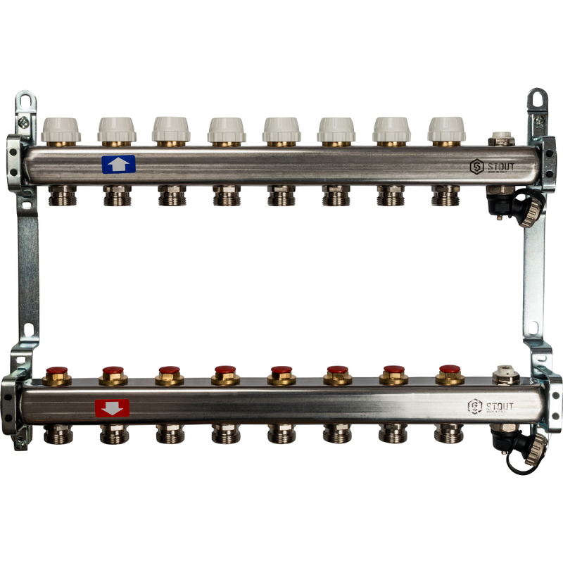 STOUT Коллектор из нержавеющей стали без расходомеров, с клапаном вып. воздуха и сливом 8 вых.