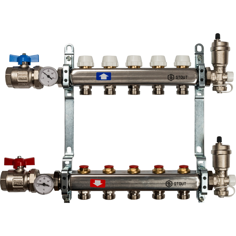 Коллекторные блоки STOUT производятся в Италии под тщательным контролем, проходя многочисленные тесты и сертификацию оборудования. Благодаря этому распределительные коллекторы STOUT обладают рядом преимуществ, среди которых надежность конструкции, качественные материалы, оптимальная комплектация блока, варианты исполнения для теплого пола и для радиаторной разводки.
