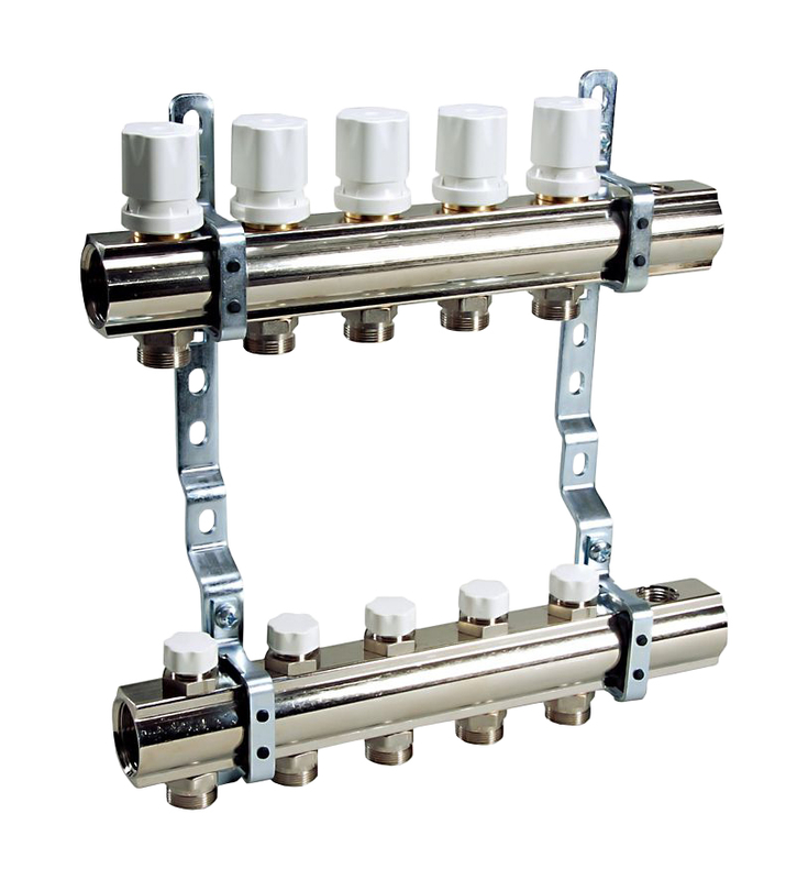 — Обратный коллектор со встроенными вентилями с маховичком для ручной регулировки. Вентили предусматривают возможность термоэлектрической регулировки при помощи термоэлектрической головки.