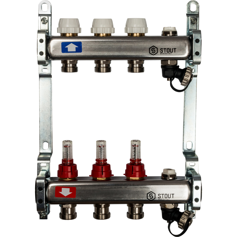 STOUT Коллектор из нержавеющей стали с расходомерами, с клапаном вып. воздуха и сливом 3 вых.