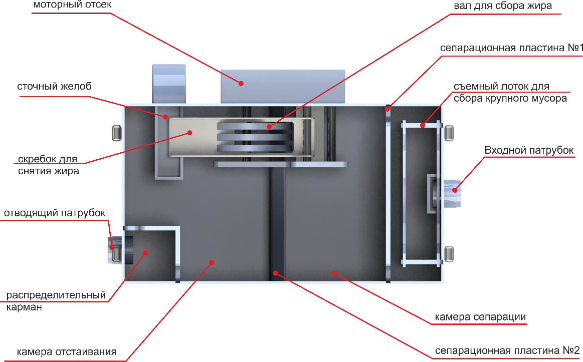 В камере отстаивания происходит окончательное отделение частиц жира от воды за счет разницы в удельном весе. Жир, скопившийся на поверхности воды, при помощи скребка собирается с вращающегося вала и по сточному желобу попадает в отдельно стоящую канистру для отходов, которую после накопления легко заменить на новую.